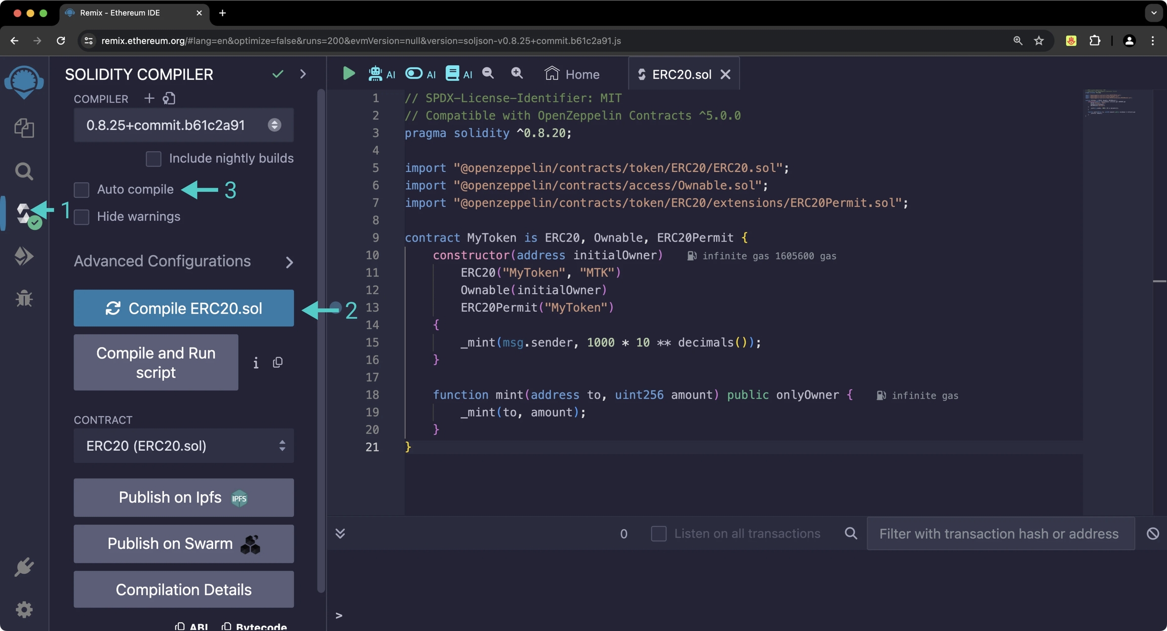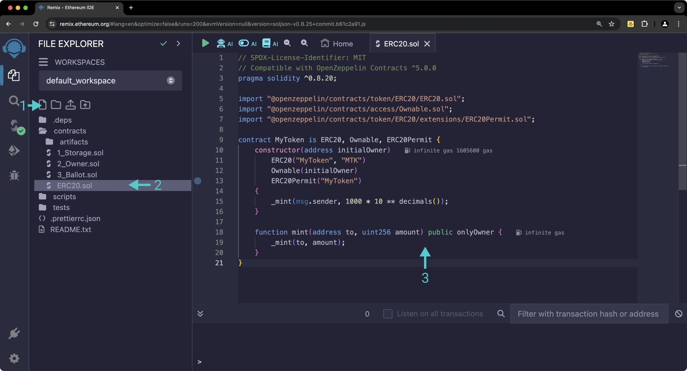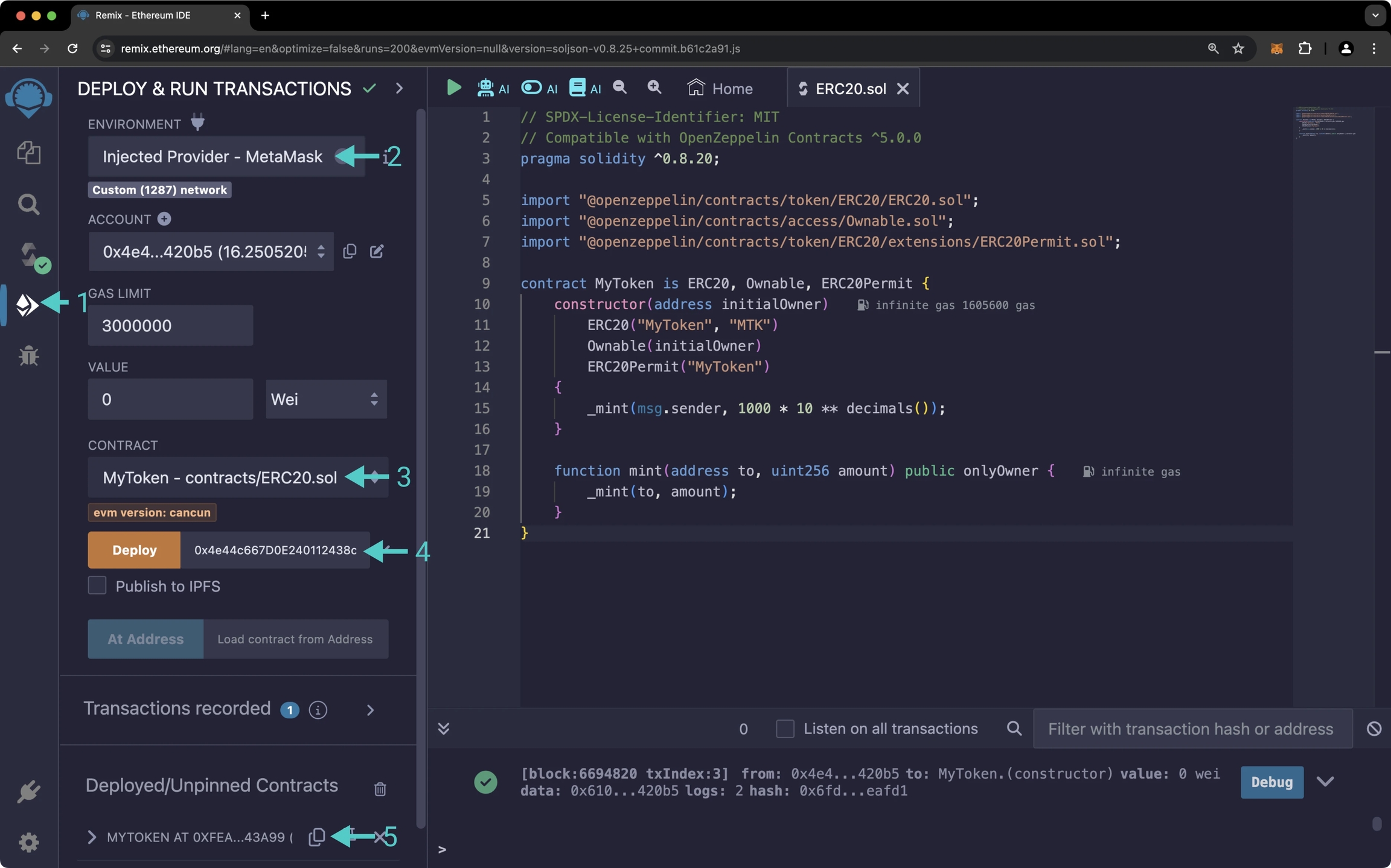 MyTokencontract inside theERC20.solfileEnter the address of the initial owner and click on the Deploy button. Review the transaction information in MetaMask and confirm it