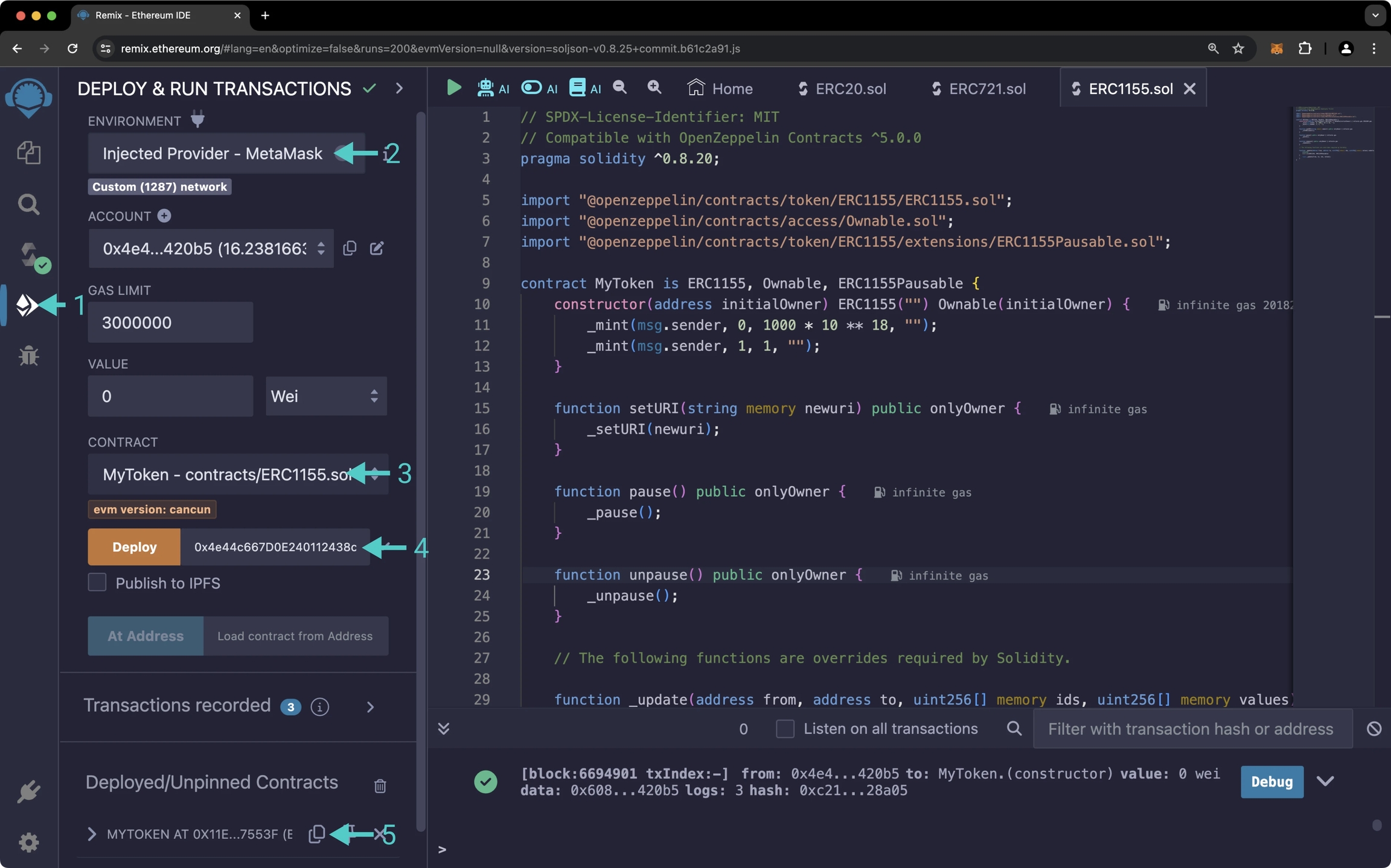 MyTokencontract inside theERC1155.solfileEnter the address of the initial owner and click on the Deploy button. Review the transaction information in MetaMask and confirm it