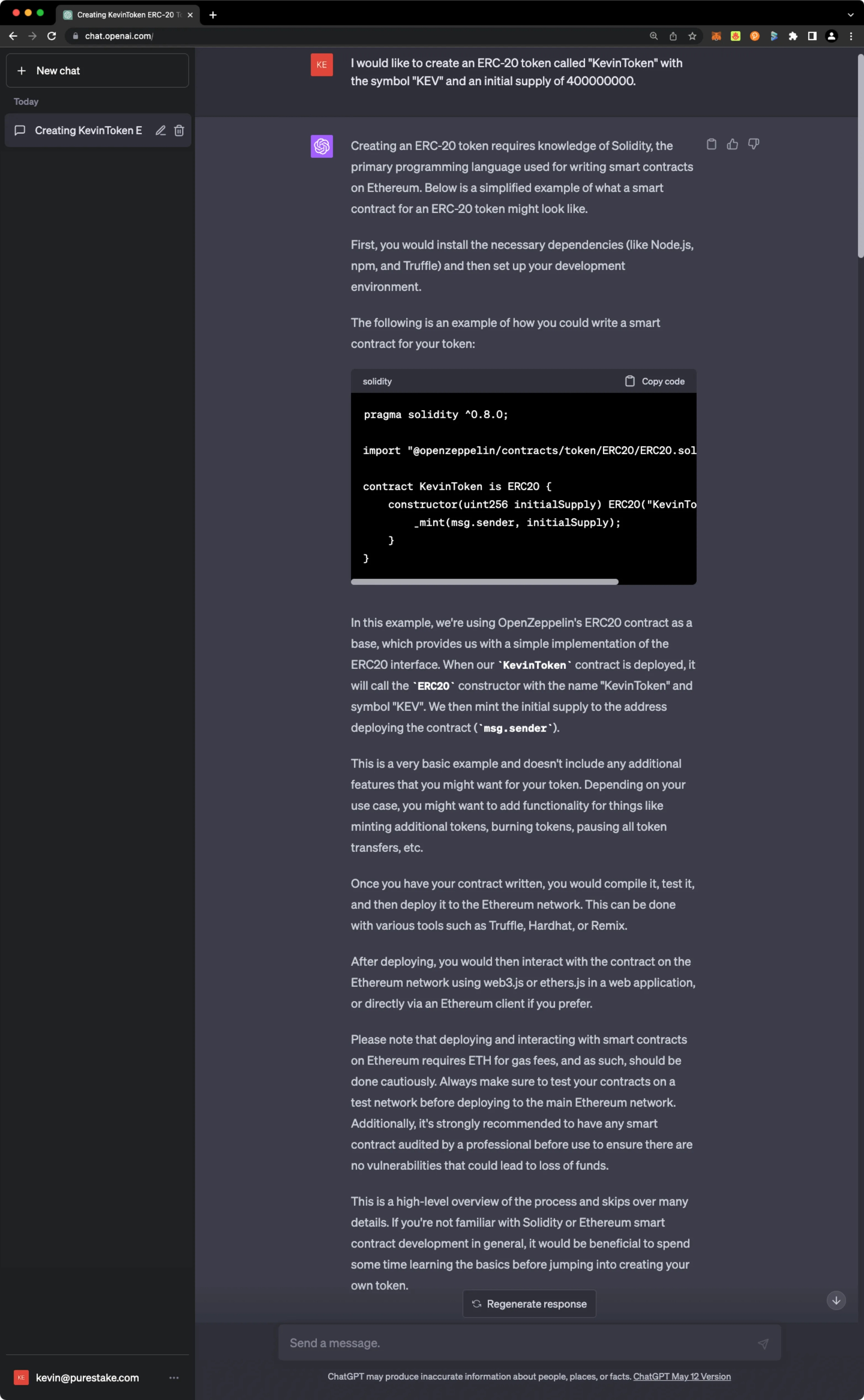 This is a great start. ChatGPT has produced for us a simple yet functional ERC-20 token that meets all of the parameters that we have specified. It also clarified how it created the ERC-20 token contract using the OpenZeppelin standard and where the initial token supply is directed. Finally, it reminds us that this is just a start, and there may be other considerations we wish to implement, like minting and burning.