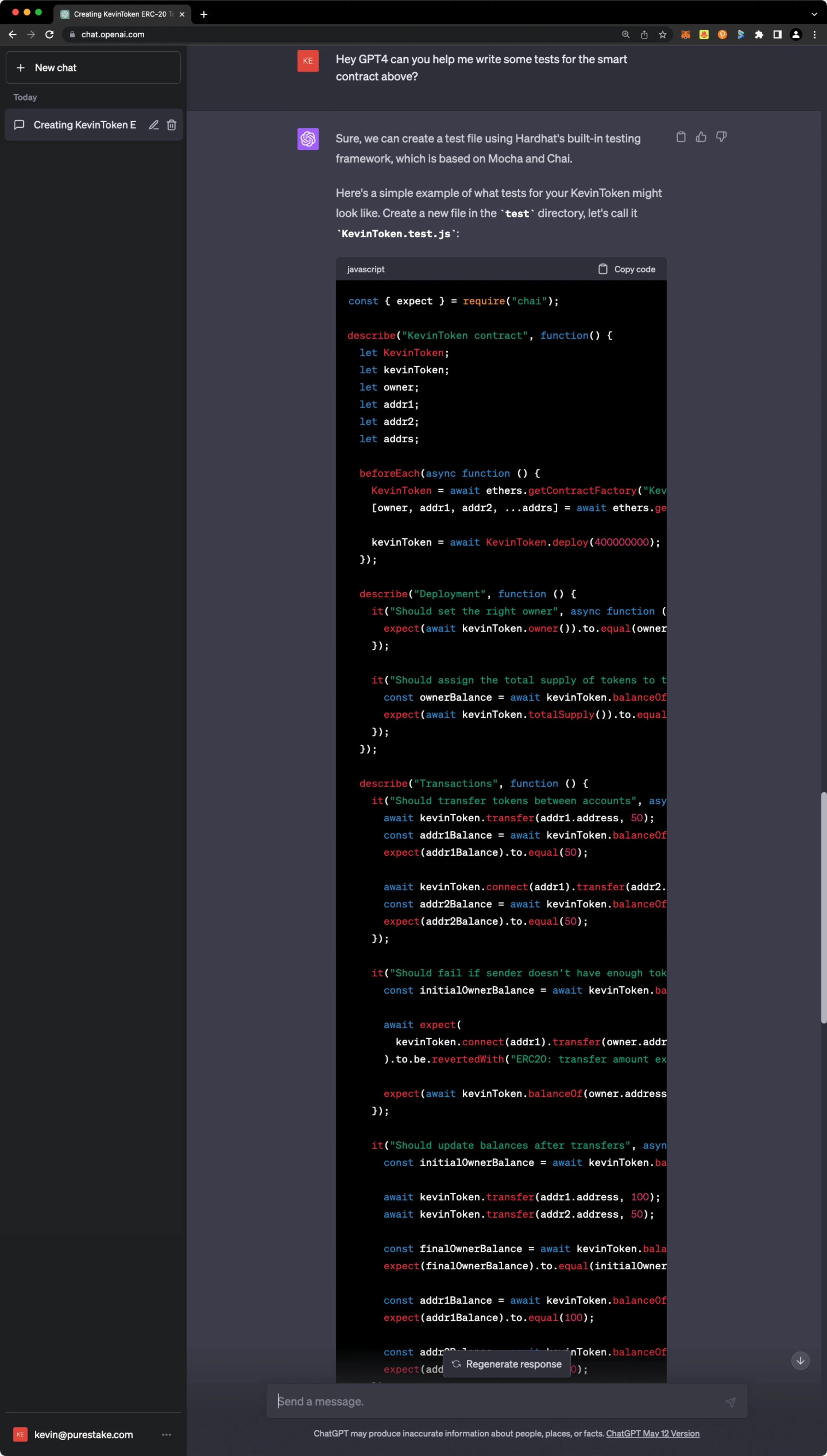 By now, you're nearly a ChatGPT savant. So it should come as no surprise that ChatGPT's capabilities extend to writing test cases for your smart contracts, and all you need to do is ask: