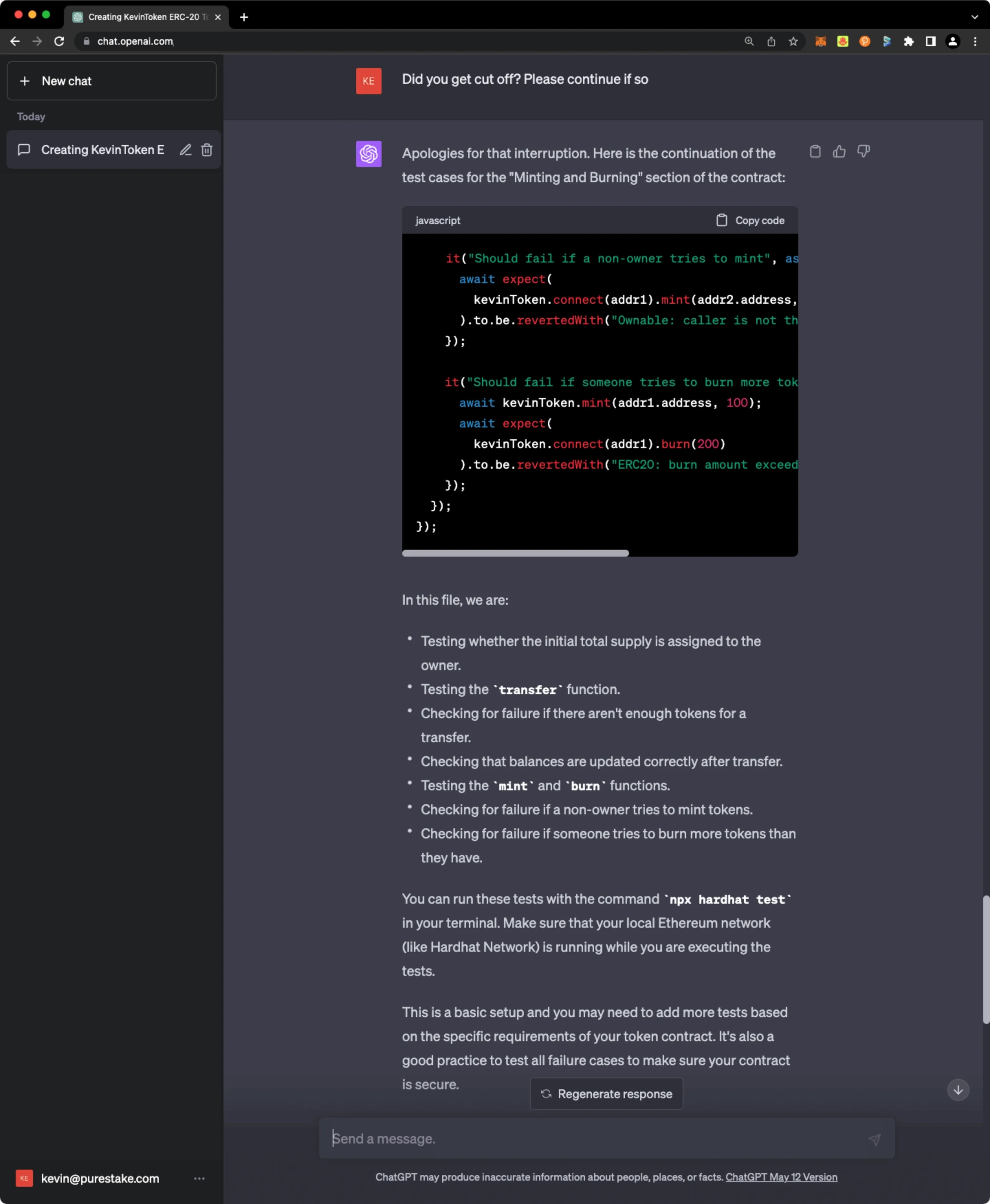 ChatGPT provides us with a slew of test cases, especially surrounding the mint and burn functionality. While it's busy writing test cases, it appears to trail off and stop without its typical summary remarks at the end. This interruption stems from ChatGPT's 500-word limit. Although the 500-word limit is a hard stop, ChatGPT's train of thought continues, so you can simply ask it to continue, and it will happily oblige. Note that for subscriptions with limited messages, this will count as an additional message from your allocation.