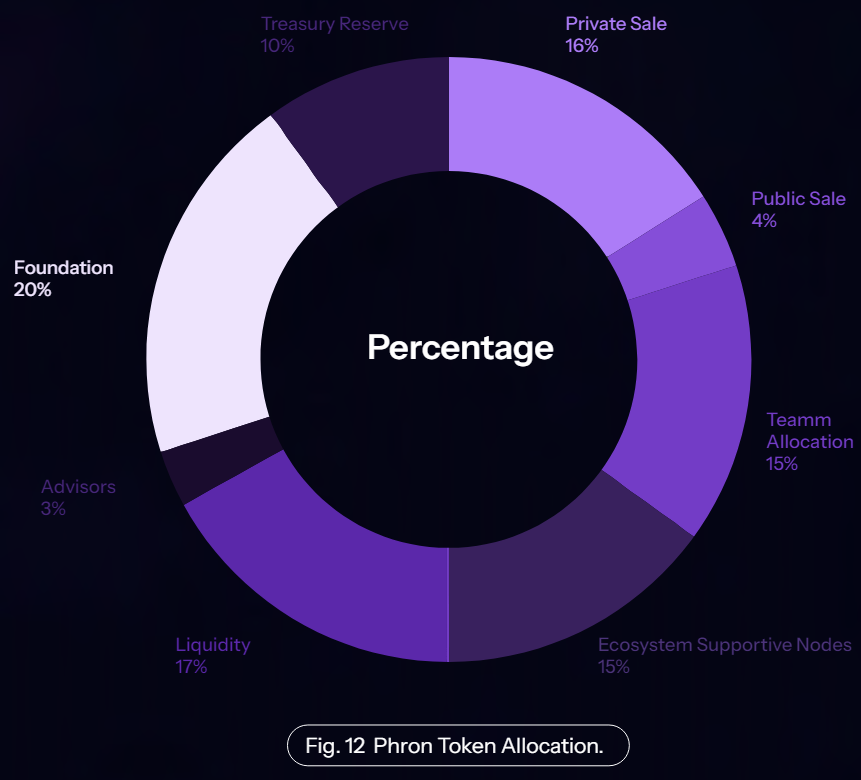 **Foundation (20%):** Fully unlocked. The funds will be used for building the L0 and the grants program. The grants program will fund L1s with a strategic focus, facilitating the creation of the Phron ecosystem. The foundation will be utilized to support the construction of Layer 0 and the development of the system. This allocation strategy is designed to prevent the distribution of excessively large stakes to any particular group, thereby helping to manage early-stage volatility.
