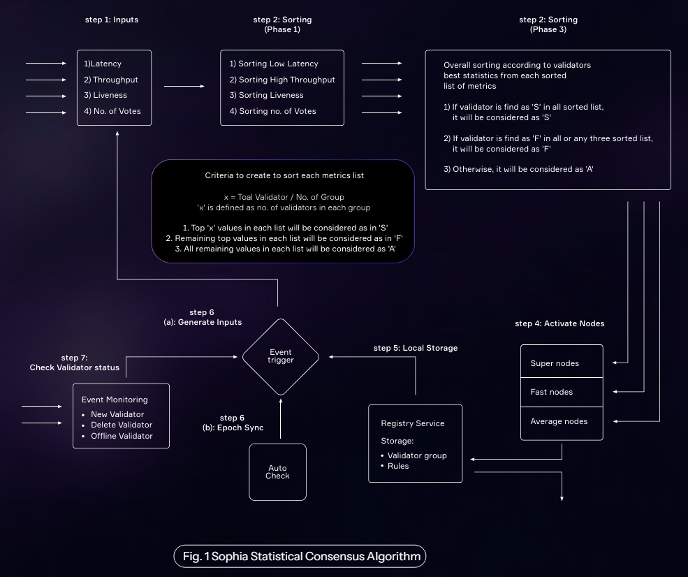 Sophia utilizes a set of rules designed to analyze and interpret the metrics data of nodes, uncovering their functional capacity to participate in the network. Through this application, three categories of validators are activated to process a broad spectrum of transactions submitted at varying fee rates. This mechanism enhances the block production process by expanding the chain’s capabilities, setting the standard transaction fee remarkably low based on previously mentioned average metrics. This standard cost applies to all transactions created and submitted by end-users, ensuring their rapid processing is comparable to high-fee transactions on other blockchains