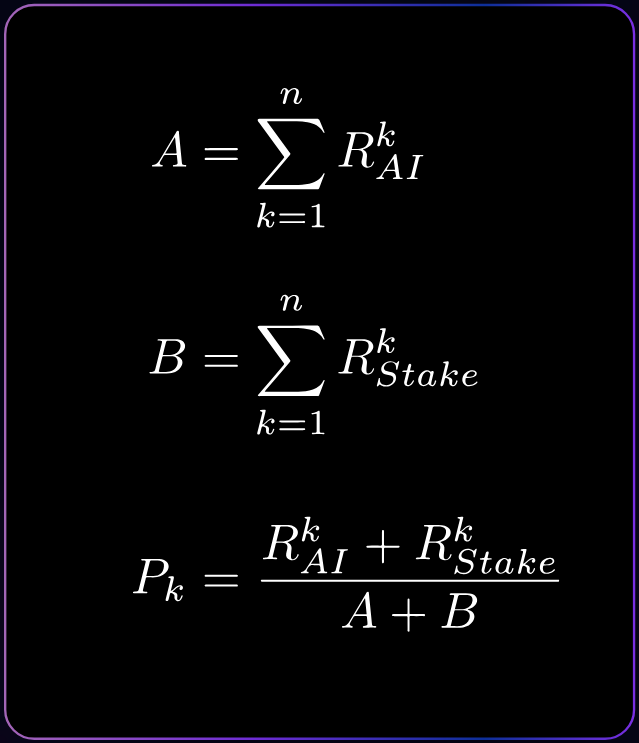 where A is the sum of AI ranks for all nodes, B is the sum of stake-based ranks, and Pk represents the selection probability of node k