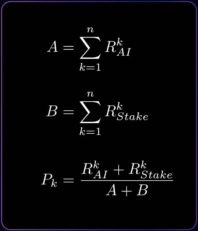 where A is the sum of AI ranks for all nodes, B is the sum of stake-based ranks, and represents the selection probability of node k