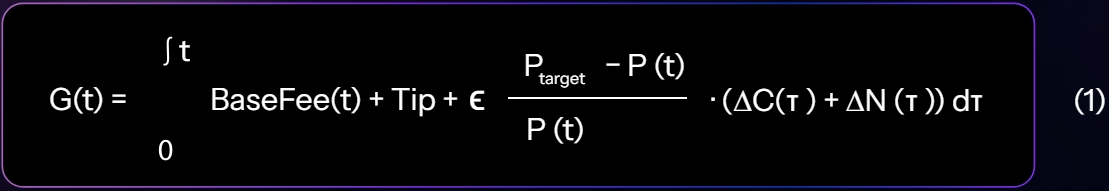 Optimizing for network efficiency and user experience, we employ a dynamic gas fee model, drawing inspiration from Ethereum’s EIP-1559 [15], formulated thus: